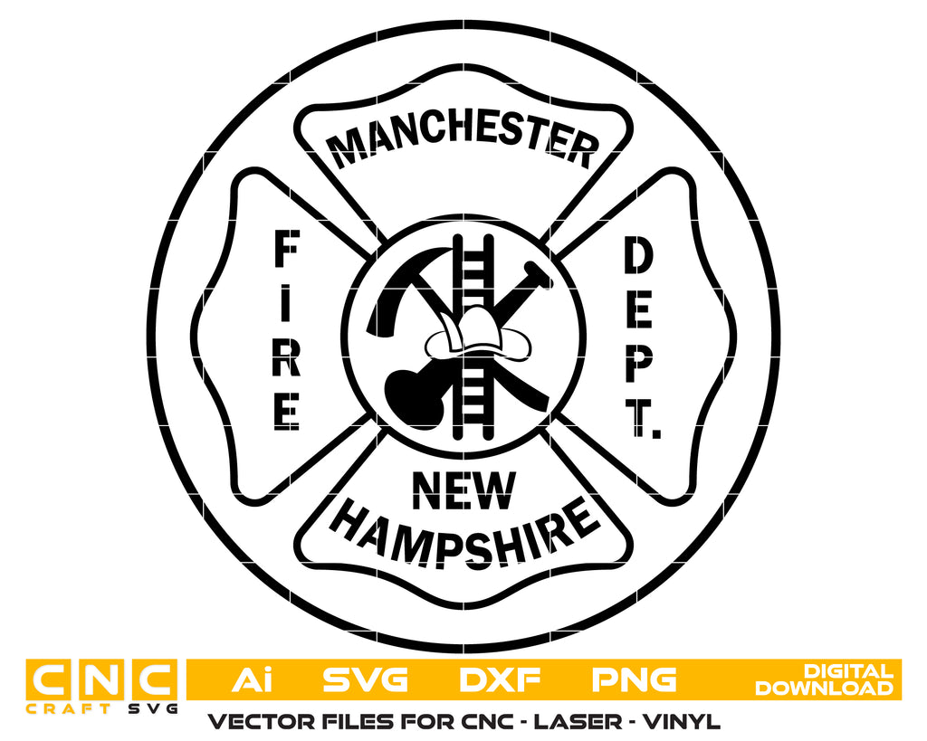 Celebrate the bravery, dedication, and service of New Hampshire firefighters with this Manchester Fire Department Patch SVG — a crisp, high-quality vector design perfect for crafting, printing, engraving, and commemorative projects.