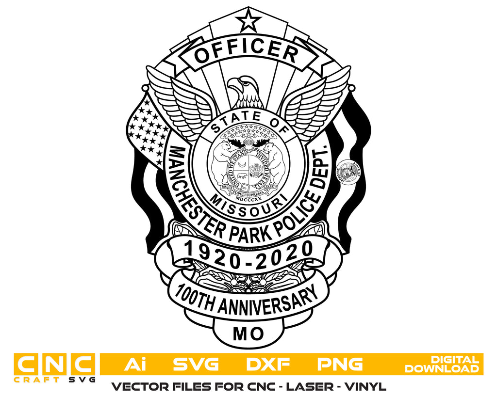 Celebrate a century of service with this Manchester Park Police Department Officer Badge SVG (1920–2020) — a crisp, high-quality vector design honoring the 100th anniversary of Missouri law enforcement. Perfect for crafting, printing, engraving, and commemorative projects.