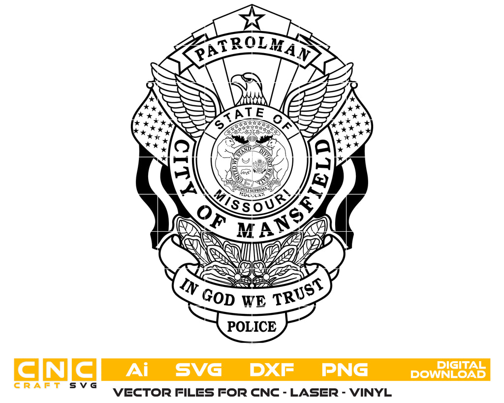 Honor the service, dedication, and professionalism of Missouri law enforcement with this Mansfield Police Patrolman Badge SVG — a crisp, high-quality vector design perfect for crafting, printing, engraving, and commemorative projects.