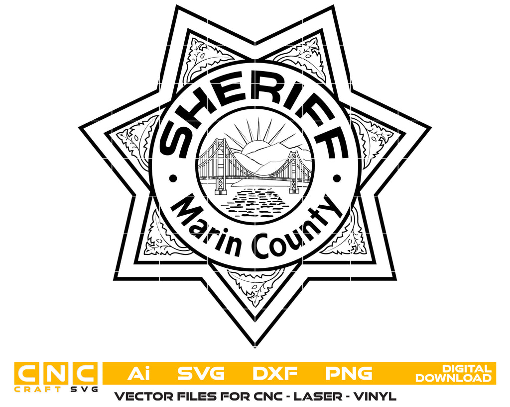 Create professional-quality law enforcement designs with this Marin County Sheriff Badge SVG, a clean and detailed vector badge inspired by the Marin County Sheriff’s Office in California. Designed for accuracy and clarity, this badge artwork is ideal for high-quality cutting, engraving, and printing applications. Perfect for plaques, decals, uniforms, signage, and collectible sheriff badges.