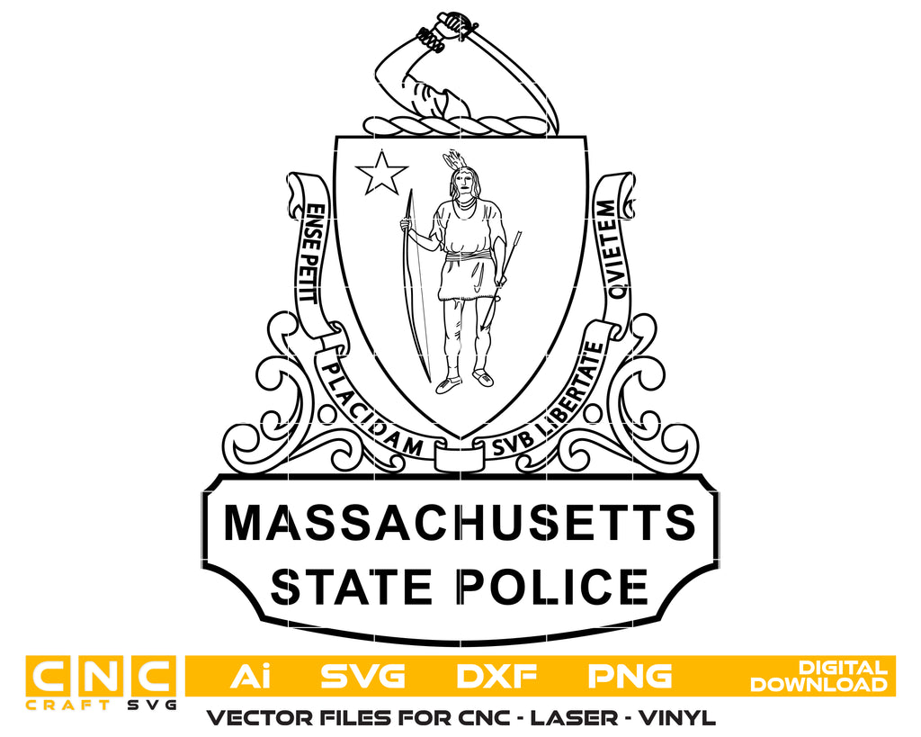 Create professional-quality law enforcement designs with this Massachusetts State Police Trooper Hat Badge SVG, a clean and detailed vector badge inspired by the Massachusetts State Police trooper hat insignia. Designed for accuracy and clarity, this badge artwork is ideal for high-quality cutting, engraving, and printing applications. Perfect for plaques, decals, uniforms, signage, and collectible state police badges.