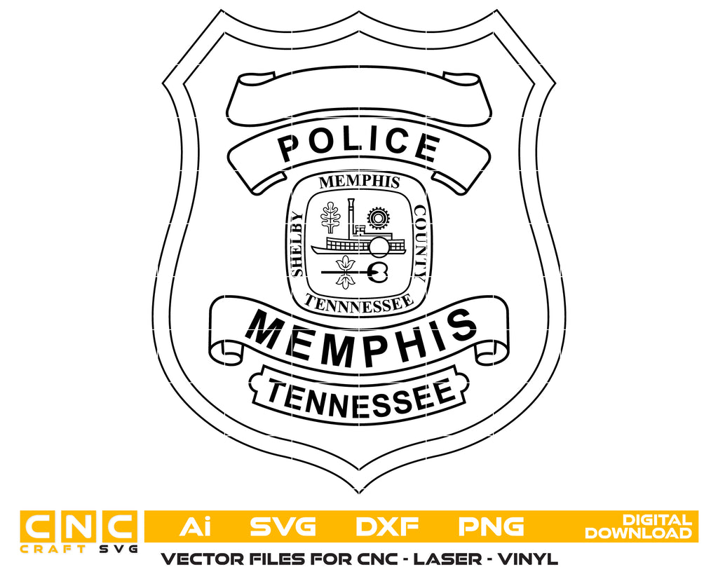 Download the Memphis Tennessee Police Badge in sharp, scalable vector format—perfect for laser engraving, vinyl decals, plaques, apparel printing, and law enforcement tribute displays. Crafted with precision for clean, professional results on any machine or material.
