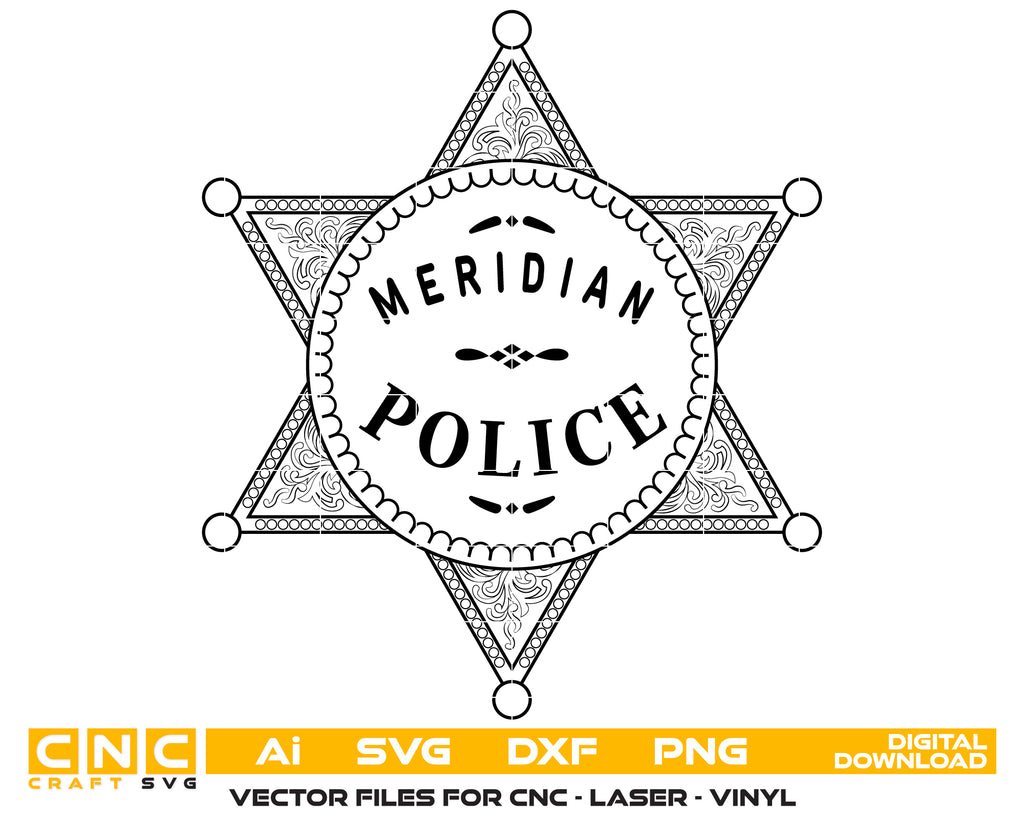 Honor the service, dedication, and professionalism of law enforcement with this Meridian Police Badge SVG — a crisp, high-quality vector design perfect for crafting, printing, engraving, and commemorative projects.