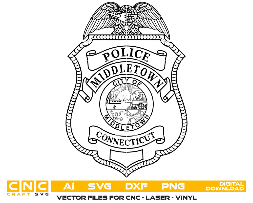 Honor the service, dedication, and professionalism of Connecticut law enforcement with this Middletown Police Department Badge SVG — a crisp, high-quality vector design perfect for crafting, printing, engraving, and commemorative projects.