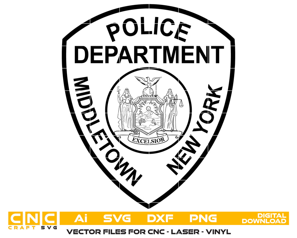 Create professional law enforcement–themed projects with this Middletown Police Dept. Patch SVG, a detailed vector illustration inspired by the official patch used by the Middletown Police Department in New York. Perfect for crafting, engraving, printing, apparel, and commemorative displays.