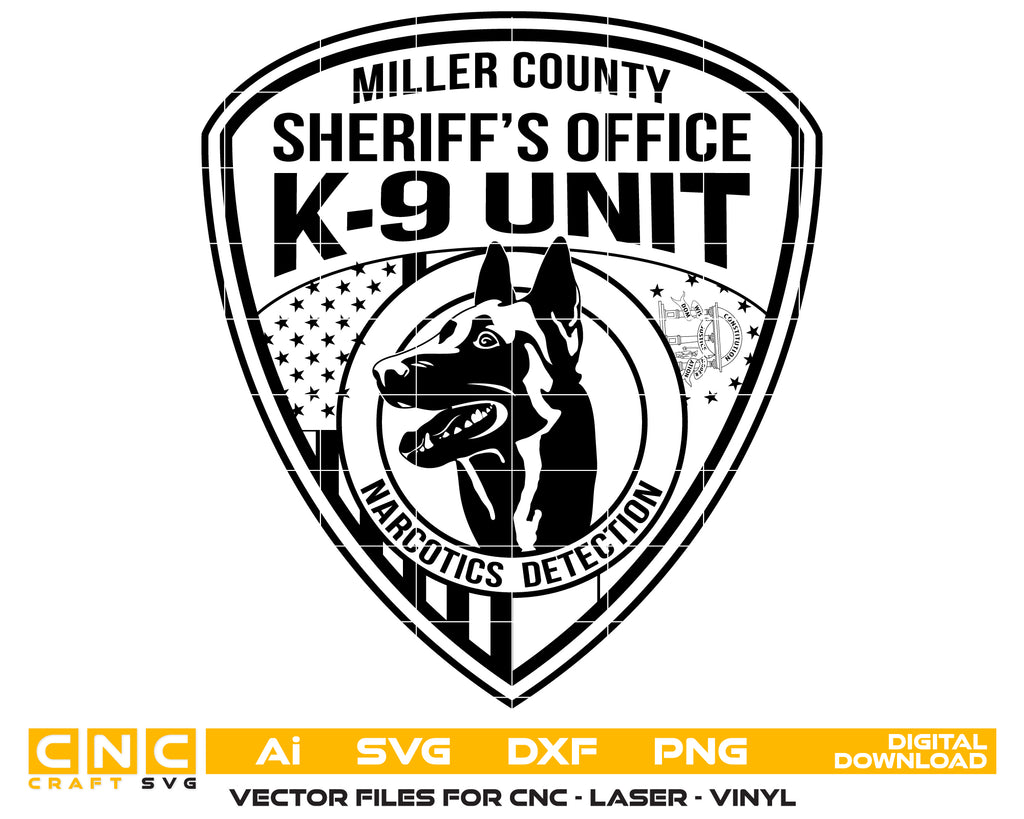 Create professional-quality law enforcement designs with this Miller County Sheriff’s Office K-9 Unit Badge SVG, a clean and detailed vector badge inspired by the K-9 Unit of the Miller County Sheriff’s Office. Designed for accuracy and clarity, this badge artwork is ideal for high-quality cutting, engraving, and printing applications. Perfect for plaques, decals, uniforms, signage, and collectible K-9 unit badges.
