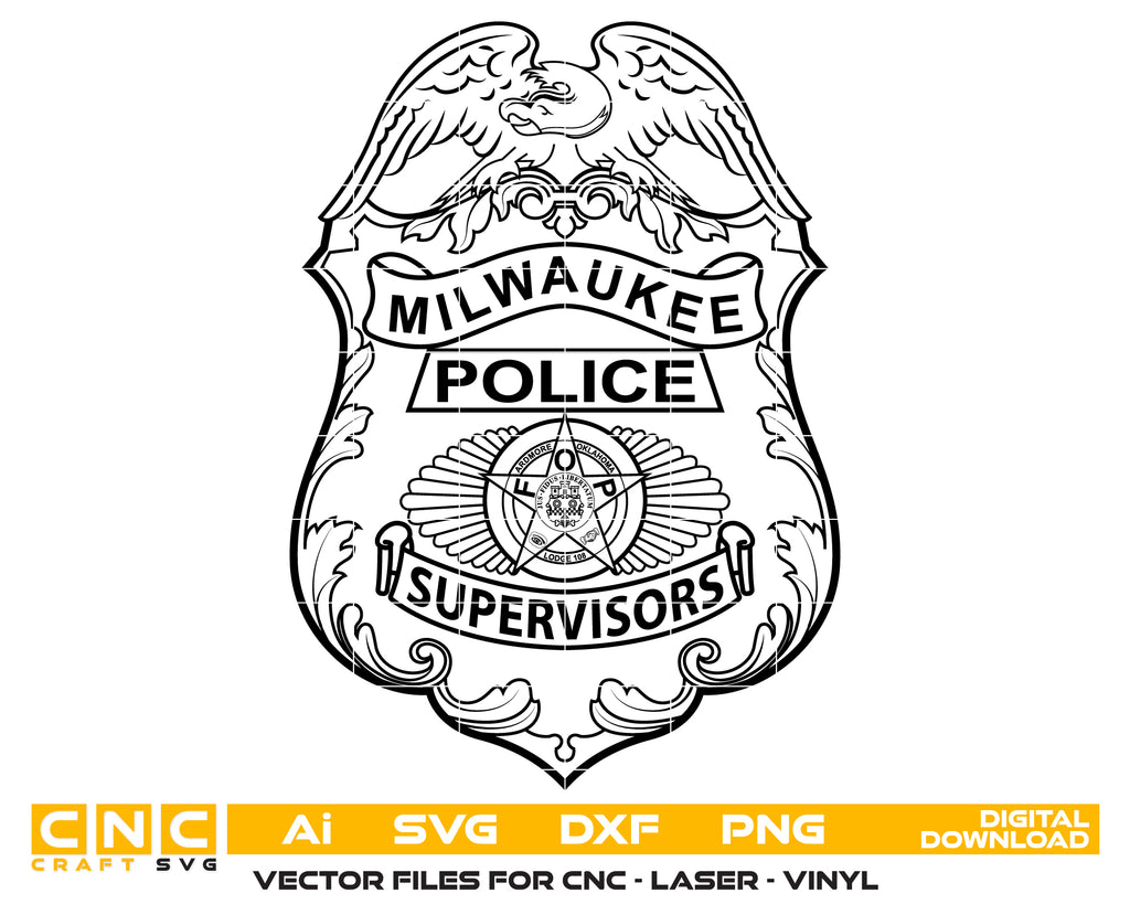 Honor the leadership of law enforcement with this Milwaukee Police Supervisors Badge SVG. This intricate vector design features the classic eagle-topped shield, complete with bold "Milwaukee Police" and "Supervisors" banners. At its center, the badge uniquely showcases the Fraternal Order of Police (FOP) star emblem, specifically detailing Lodge 108 (Ardmore, Oklahoma). Meticulously traced for clean lines, this file is optimized for CNC routing, laser engraving, and vinyl cutting. It is the perfect choice for creating retirement plaques, shadow boxes, and custom tributes.