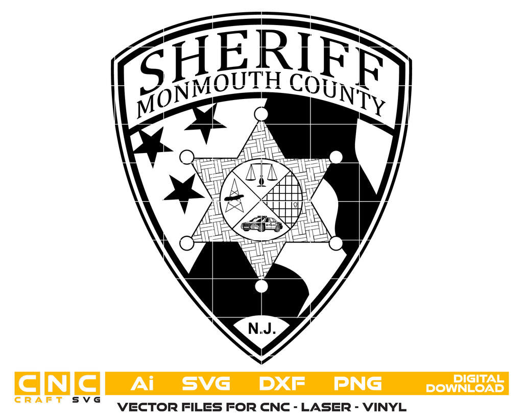 Download the Monmouth County Sheriff Logo SVG. This highly detailed New Jersey law enforcement vector is perfectly optimized for CNC routers, laser engraving, and vinyl cutting. With clean, meticulously traced lines, this vector file is ideal for creating custom deputy retirement plaques, shadow boxes, and unique department gifts.