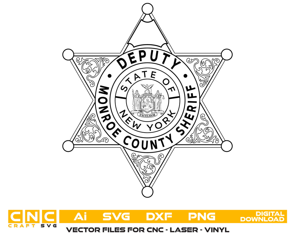 The Monroe County Deputy Sheriff Badge SVG represents authority, service, and integrity within county law enforcement. Expertly designed in scalable vector format, this badge is perfect for CNC cutting, laser engraving, vinyl decals, uniforms, plaques, and collectible projects. Ideal for sheriff departments, collectors, and engraving artists, it ensures crisp detailing on metal, wood, fabric, and acrylic, proudly showcasing the Monroe County Sheriff’s Office emblem.