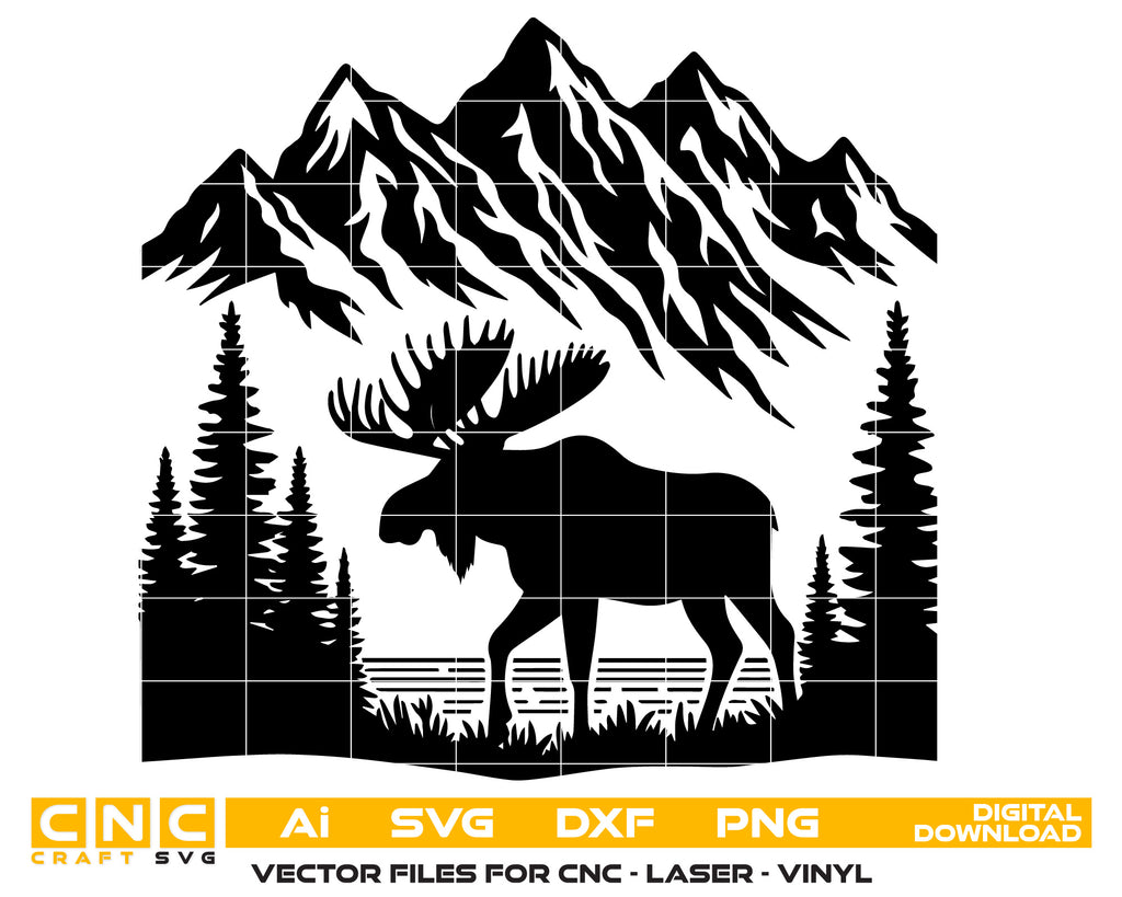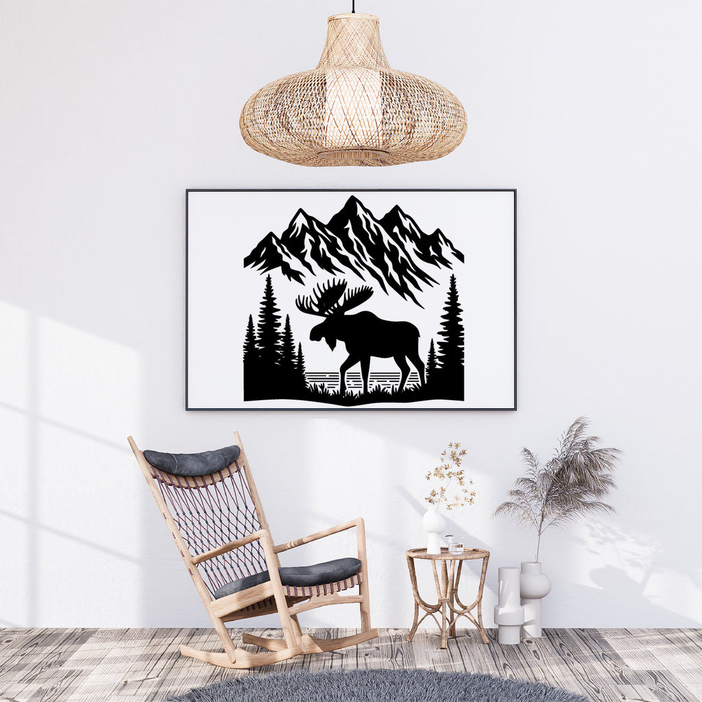 Discover this high-quality Vector SVG file, designed for CNC cutting, laser engraving, and woodworking. This bold design features a majestic moose framed by rugged mountain peaks—ideal for cabin signs, rustic décor, and wildlife-inspired creations.