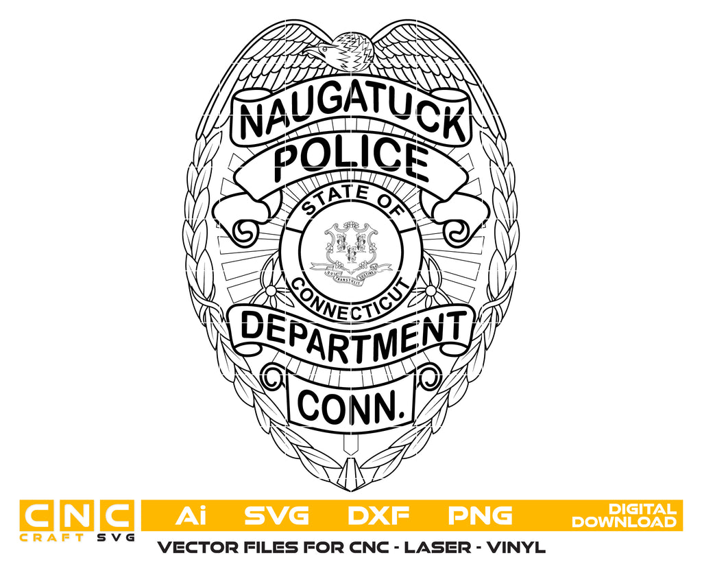 Honor the professionalism, service, and dedication of Connecticut law enforcement with this Naugatuck Police Department Badge SVG — a crisp, high-quality vector design perfect for crafting, printing, engraving, and commemorative display projects.