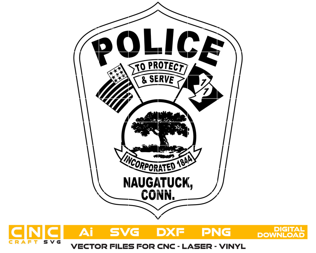 Create meaningful tribute pieces, custom apparel, decals, and display items with this Naugatuck Police Department Patch SVG — a sharp, high-detail vector version of the classic Connecticut police shoulder patch.