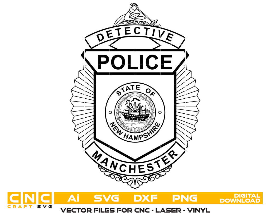 Honor the professionalism and dedication of law enforcement with this New Hampshire Police Detective Badge SVG — a crisp, high-quality vector design perfect for crafting, engraving, printing, displays, and collectible artwork.