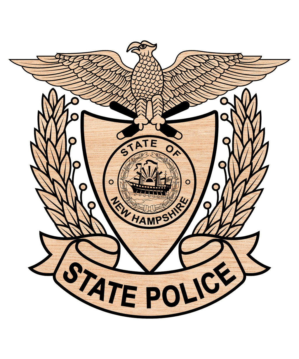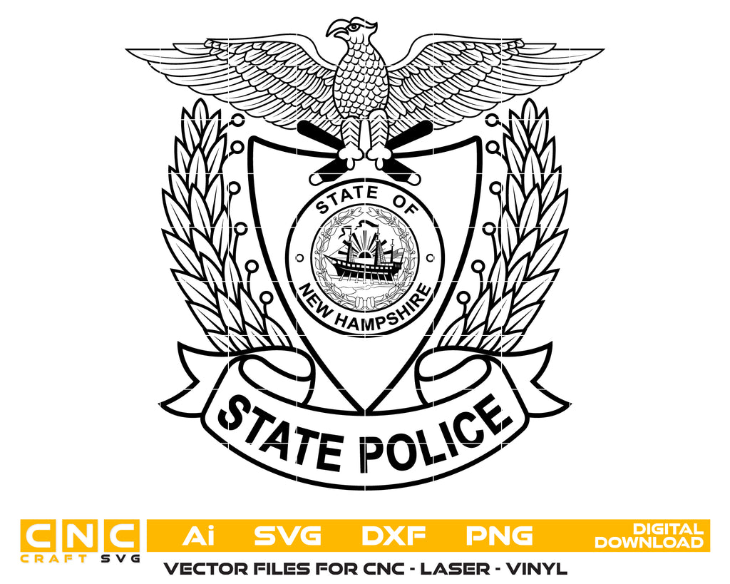 Download a high-quality vector of the New Hampshire State Police Hat Logo. This detailed design is perfect for engraving, printing, vinyl cutting, decals, and display projects. The file includes SVG, PNG, AI, DXF, and PDF formats for maximum compatibility with Cricut, Silhouette, CNC machines, and design software.