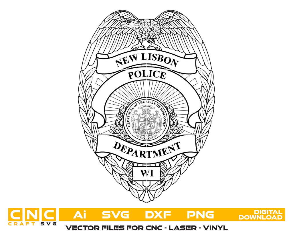 Show appreciation for public safety professionals with this New Lisbon Police Department Badge SVG — a clean, highly detailed vector design ideal for crafting, engraving, printing, and commemorative projects.
