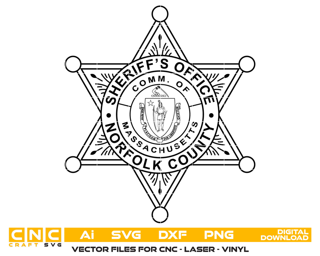 Create professional-quality law enforcement designs with this Norfolk County Sheriff’s Office Badge SVG, a clean and detailed vector badge inspired by the Norfolk County Sheriff’s Office in Massachusetts. Designed for accuracy and clarity, this badge artwork is ideal for high-quality cutting, engraving, and printing applications.