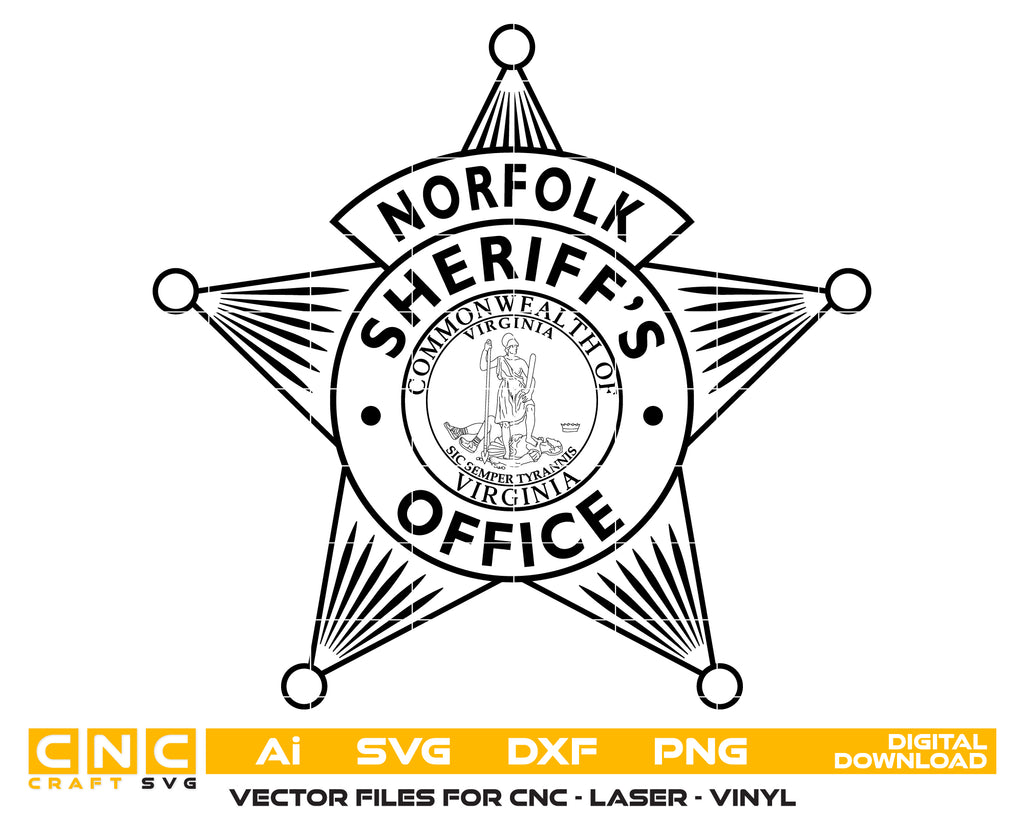 Create professional-quality law enforcement designs with this Norfolk Sheriff’s Office Badge SVG, a clean and detailed vector badge inspired by the Norfolk Sheriff’s Office in Virginia. Designed for accuracy and clarity, this badge artwork is ideal for high-quality cutting, engraving, and printing applications.