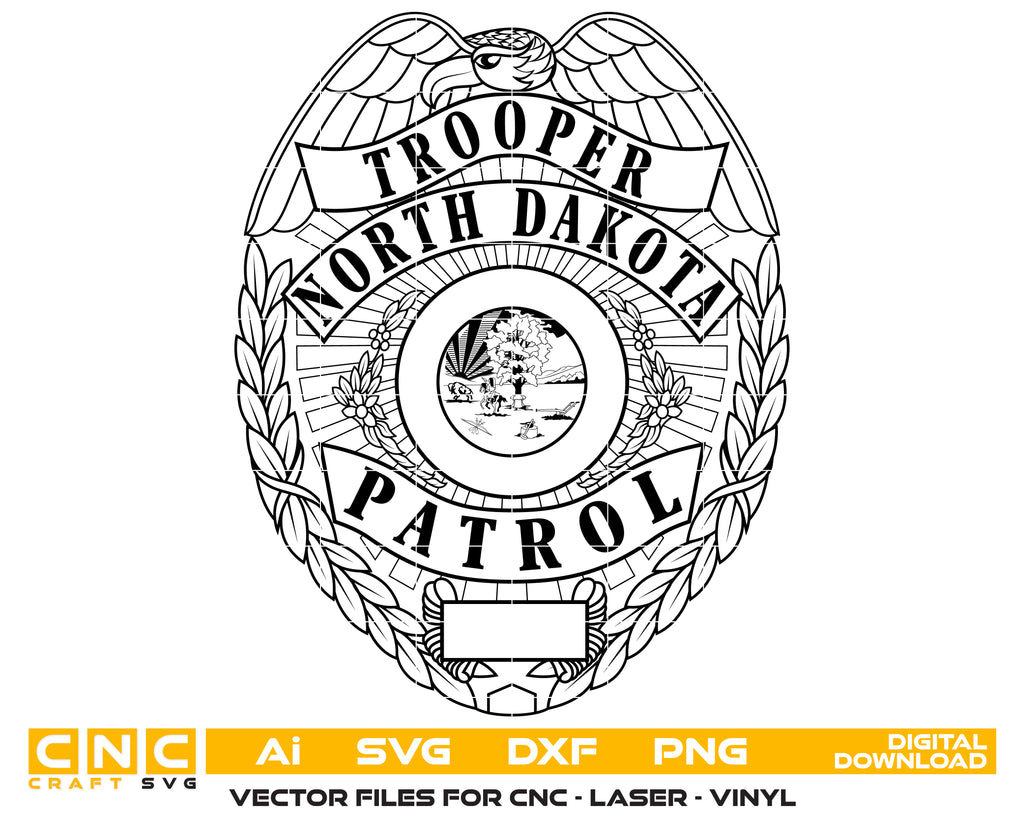 Create professional-quality law enforcement–themed projects with this North Dakota Highway Patrol Badge SVG, a detailed vector illustration inspired by the official badge worn by North Dakota Highway Patrol troopers. Designed for precision cutting, engraving, and high-resolution printing.