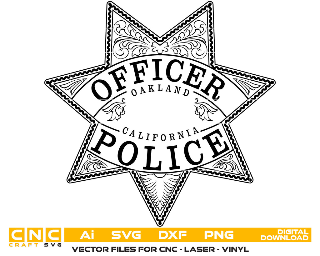 Honor law enforcement with this detailed Oakland Police Officer Badge, professionally designed for CNC cutting, laser engraving, and woodworking. This badge includes both vector and color formats, allowing for crisp, clean cuts and vibrant displays—perfect for tribute signs, display plaques, or custom décor projects.