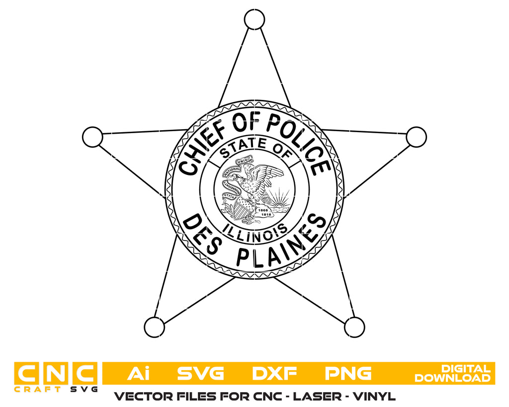 Download a high-quality Obsolete Des Plaines, Illinois Chief of Police Badge in precise vector format, ideal for Cricut, Silhouette, CNC, laser engraving, apparel printing, signage, and collector displays. This historic police badge features detailed engraving lines, accurate contours, and clean vector paths, ensuring flawless scalability for any project.