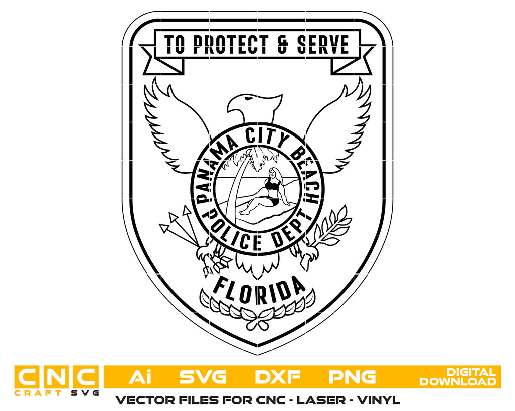 Download the Panama City Beach Police Department Patch SVG. This highly detailed, black-and-white Florida law enforcement vector features a unique shield design highlighting a soaring eagle, a coastal beach scene, and the classic "To Protect & Serve" banner. Perfectly optimized for CNC routers, laser engraving, and vinyl cutting, this clean, single-color line art vector file is ideal for creating custom police retirement plaques, wooden shadow boxes, and unique department tribute gifts.