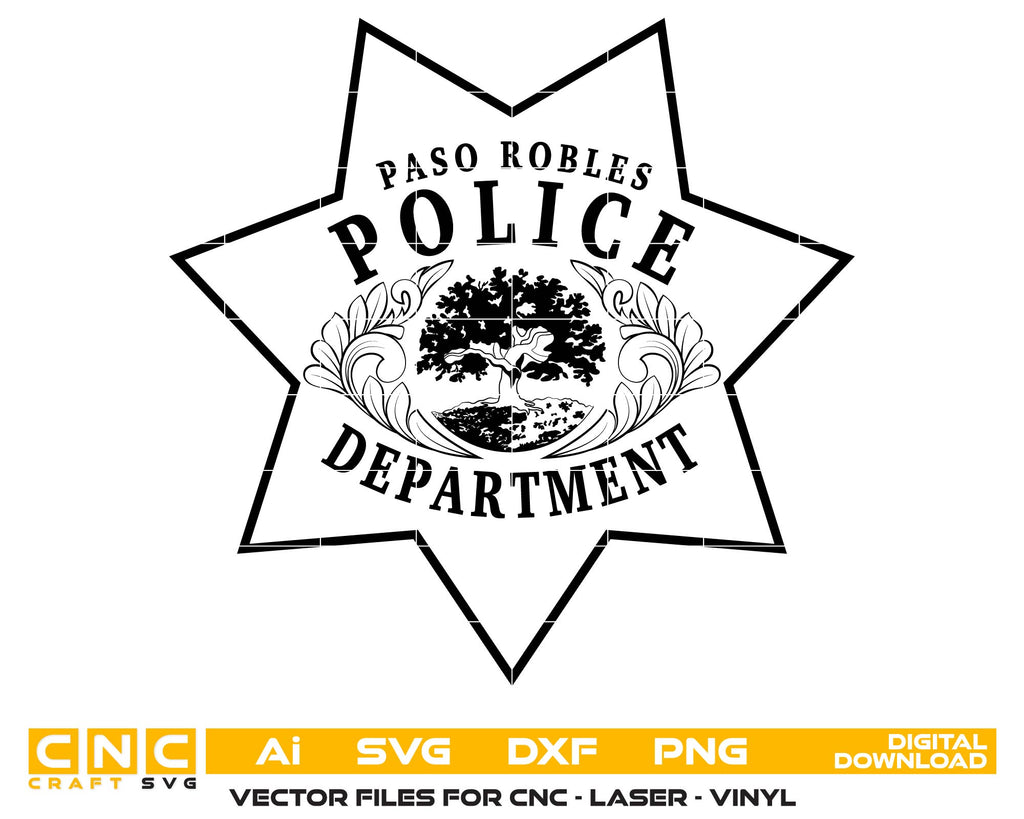 Download a high-quality Paso Robles Police Department Badge SVG, professionally redrawn with clean vector lines, accurate detailing, and smooth scalable paths. This premium police badge design is perfect for laser engraving, CNC cutting, Cricut, Silhouette, vinyl decals, plaques, signage, apparel printing, and law-enforcement collectible artwork.