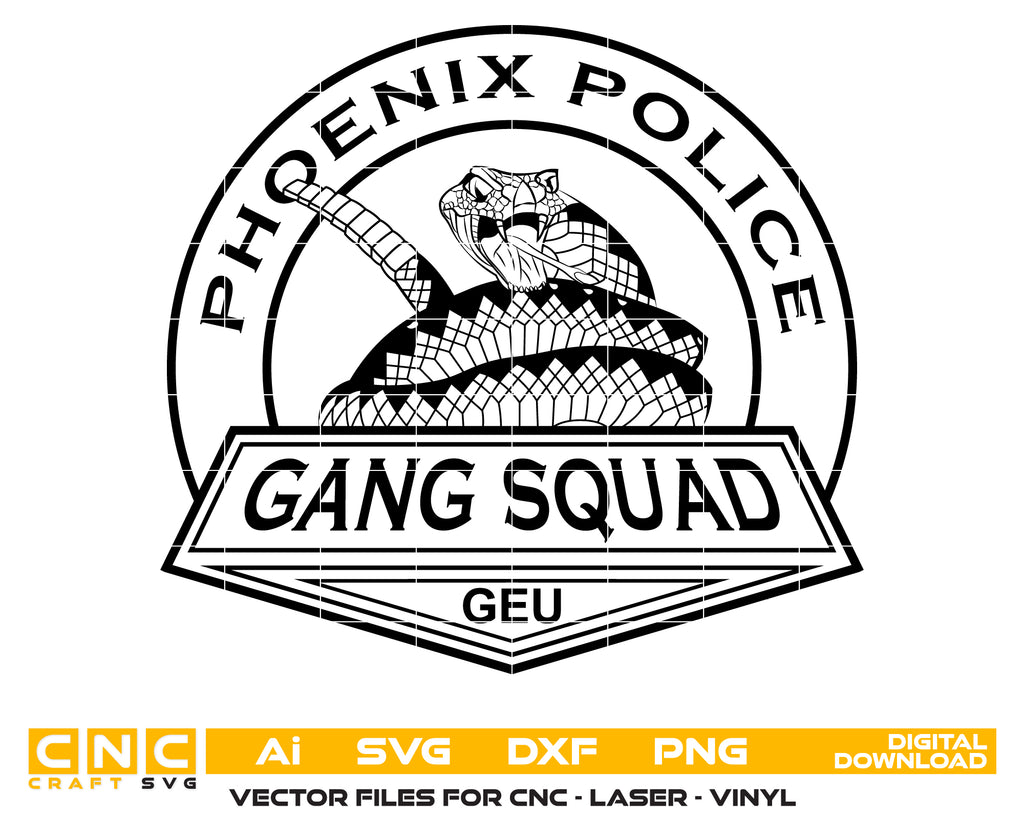 Download a professionally crafted Phoenix Police Gang Squad Logo SVG featuring sharp detailing, clean vector paths, and perfect scalability. This premium-quality vector design is ideal for Cricut, Silhouette, CNC cutting, laser engraving, vinyl decals, signage, apparel, plaques, and both print and digital projects.