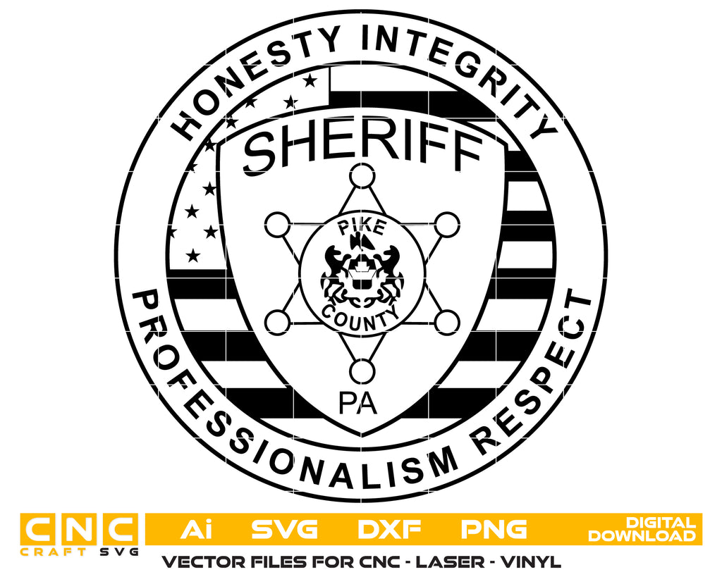 The Pike County Sheriff Office Badge SVG features a professionally detailed sheriff department emblem representing the trusted law enforcement services of Pike County. This sheriff badge vector design is ideal for CNC cutting, laser engraving, vinyl decals, plaques, uniform prints, challenge coin designs, and law enforcement memorabilia projects. With clean, scalable vector lines and precise detailing, it delivers accurate results across metal, wood, acrylic, leather, fabric, and more—perfect for designers, sheriff offices, badge collectors, and law enforcement supporters seeking an authentic Pike County sheriff badge design.