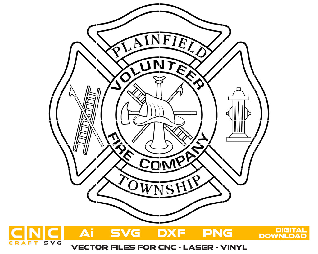 Create professional, high-quality firefighter-themed designs with this Plainfield Volunteer Fire Company Badge SVG, a detailed vector illustration inspired by the official badge of the Plainfield Volunteer Fire Company. Perfect for crafting, engraving, printing, apparel, and commemorative projects.