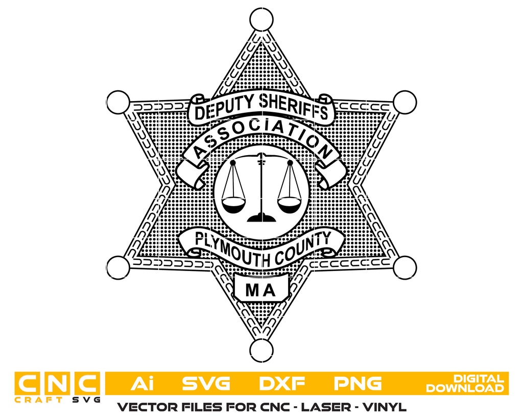 Create professional-quality law enforcement designs with this Plymouth County Deputy Sheriffs Badge SVG, a clean and detailed vector badge inspired by the Plymouth County Sheriff’s Office. Designed for accuracy and clarity, this badge artwork is ideal for high-quality cutting, engraving, and printing applications.