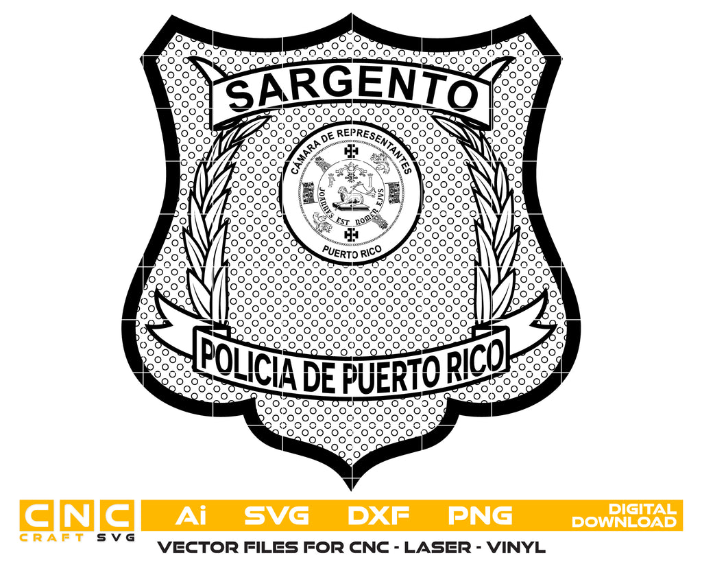 Show pride with this Policía de Puerto Rico Sargento Badge SVG. Expertly crafted in scalable vector format, this official Puerto Rico police badge design is perfect for CNC cutting, laser engraving, vinyl decals, apparel printing, plaques, signage, and woodworking projects. With sharp detailing and crisp vector lines, it ensures professional-quality results on wood, acrylic, fabric, or metal. Ideal for sergeant plaques, law enforcement signage, collectible memorabilia, and custom décor. Fully compatible with Cricut, Silhouette, CNC machines, and laser engravers, this Puerto Rico Sargento Police Badge design is available for instant download.