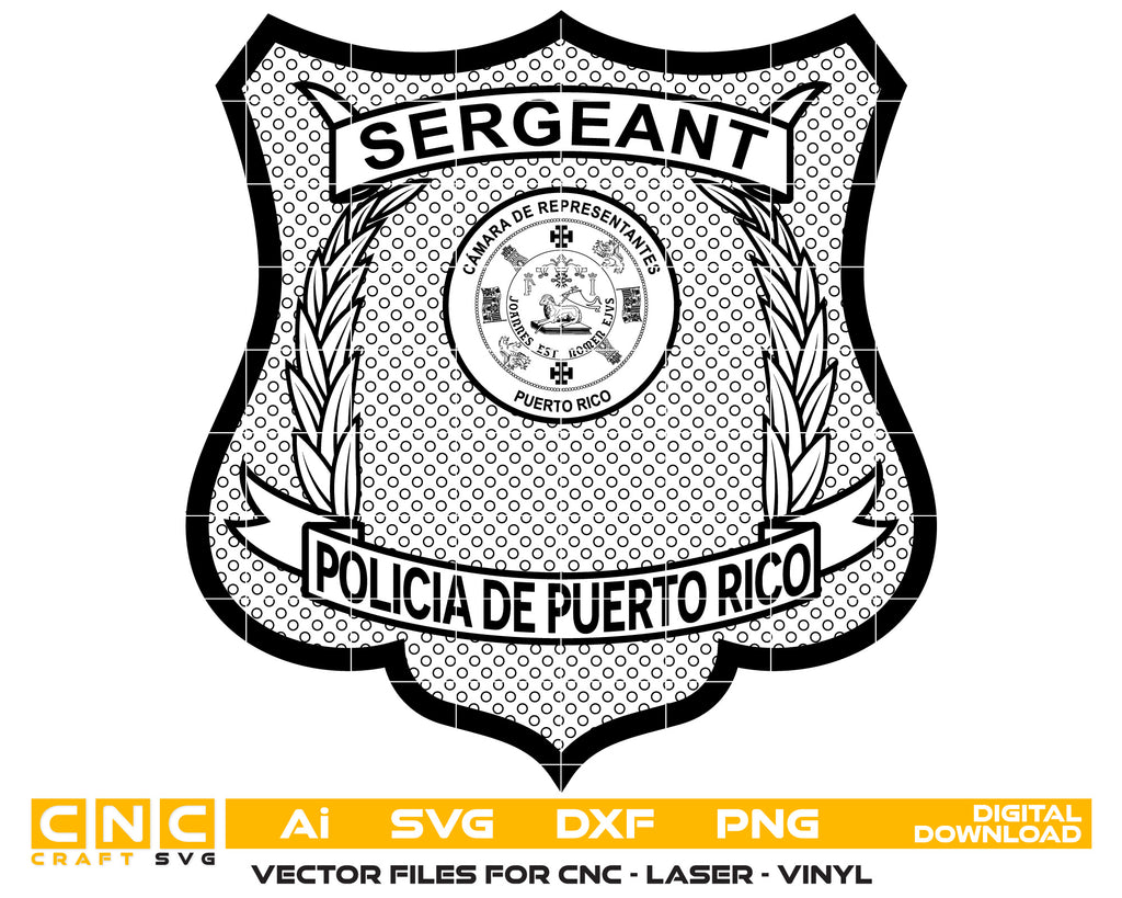 Show pride with this Policía de Puerto Rico Sergeant Badge SVG. Expertly crafted in scalable vector format, this official Puerto Rico police badge design is perfect for CNC cutting, laser engraving, vinyl decals, apparel printing, plaques, signage, and woodworking projects. Featuring sharp detailing and clean vector lines, it ensures professional-quality results on wood, acrylic, fabric, or metal. Ideal for law enforcement plaques, department signage, collectible memorabilia, and custom décor. Fully compatible with Cricut, Silhouette, CNC machines, and laser engravers, this Puerto Rico Sergeant Police Badge design is available for instant download.