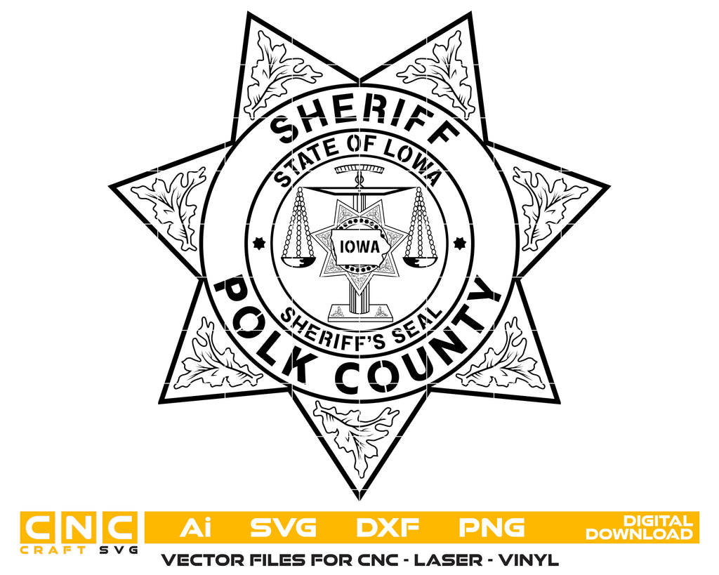 Create detailed law-enforcement–themed projects with this Polk County Sheriff’s Office Badge SVG, inspired by the official sheriff badge from Polk County, Iowa. This clean, precise vector design is perfect for crafting, engraving, printing, and commemorative displays.