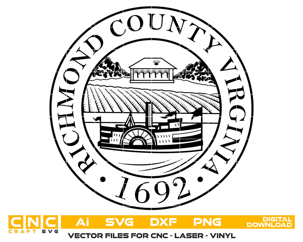 Showcase Virginian heritage with this high-resolution Richmond County Seal in vector and color formats. Ideal for CNC cutting, laser engraving, and woodworking, this design is perfect for official signage, historical displays, or custom civic décor. Optimized for clean cuts on wood, acrylic, and metal surfaces.