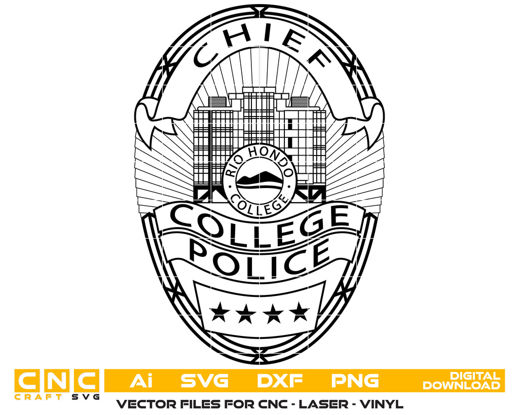 Create professional law-enforcement–themed designs with this Rio Hondo College Police Chief Badge SVG, a detailed vector illustration inspired by the official badge used by the police chief at Rio Hondo College, California. Perfect for crafting, engraving, printing, apparel, and commemorative projects.