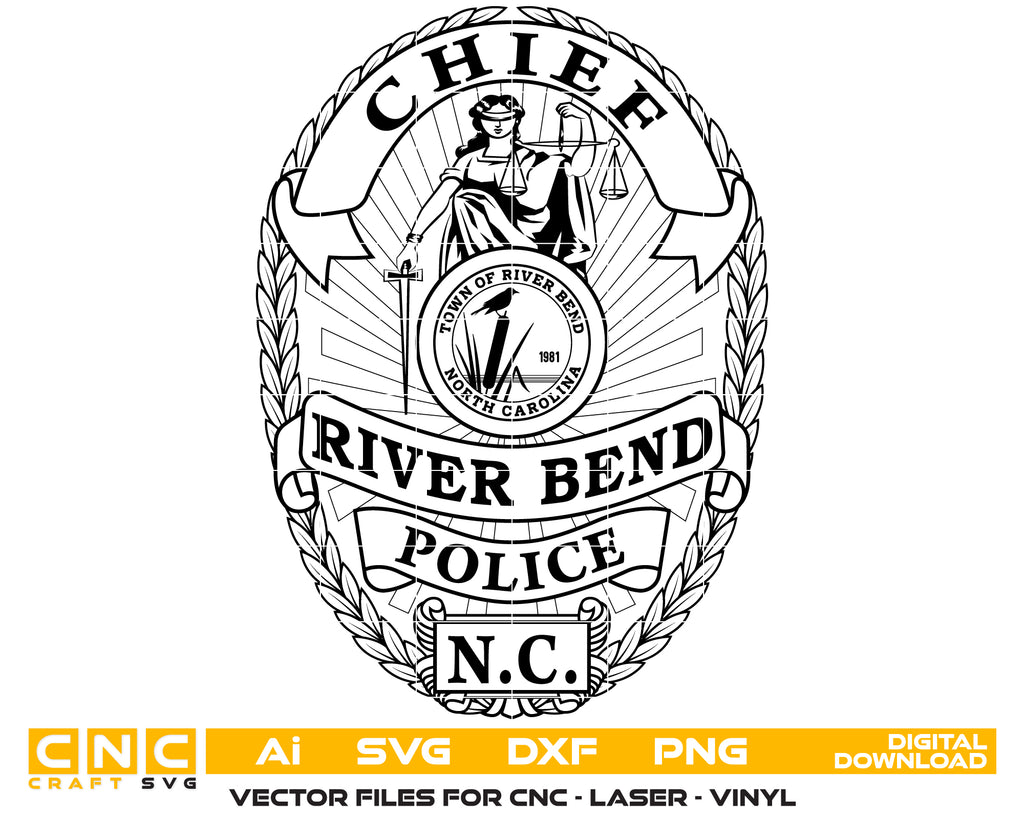 Get the detailed River Bend Police Chief Badge in high-resolution vector format—ideal for laser engraving, vinyl decals, apparel printing, signage, and police tribute projects. This clean, scalable design ensures sharp, professional-quality results across all digital and craft platforms.