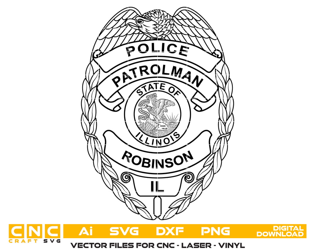 Celebrate the service, professionalism, and dedication of Illinois law enforcement with this Robinson Police Department Badge SVG — a crisp, high-quality vector design perfect for crafting, printing, engraving, and commemorative projects.