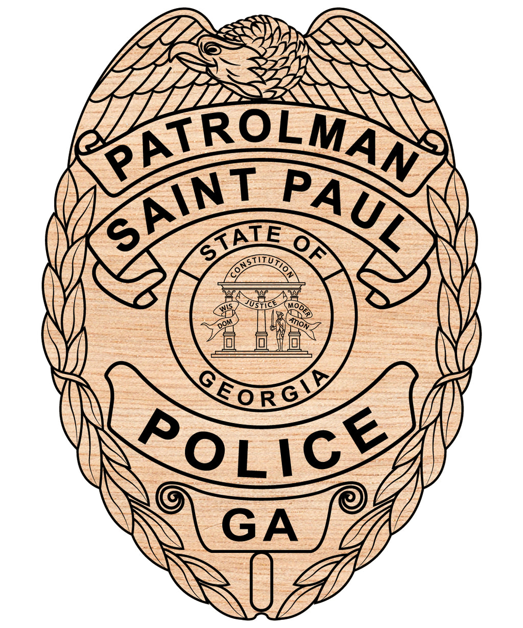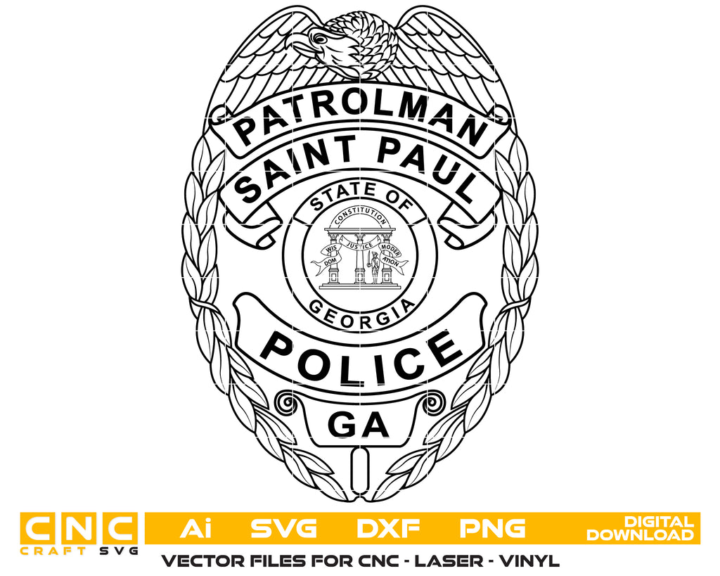 Download the Saint Paul Georgia Police Patrolman Badge in crisp, scalable vector format—perfect for laser engraving, vinyl decals, apparel printing, plaques, and law enforcement tribute projects. Professionally designed for clean lines and accurate detail across all creative platforms.