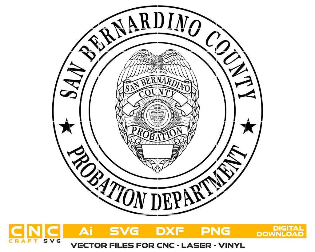 The San Bernardino County Probation Officer Badge SVG represents the authority, professionalism, and dedication of San Bernardino County Probation Officers. Created in high-quality scalable vector format, this badge is perfect for CNC cutting, laser engraving, vinyl decals, apparel, signage, and collectible projects. Ideal for law enforcement supporters, graphic designers, and collectors, it maintains crisp, professional detailing on metal, wood, fabric, or acrylic, proudly honoring the San Bernardino County Probation Department.