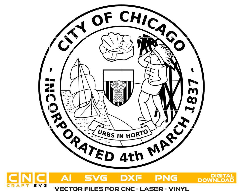 Create professional, high-quality designs with this Seal of Chicago, Illinois SVG, a detailed vector illustration of the official city seal. Perfect for printing, engraving, apparel, signage, and digital design projects celebrating Chicago’s heritage.