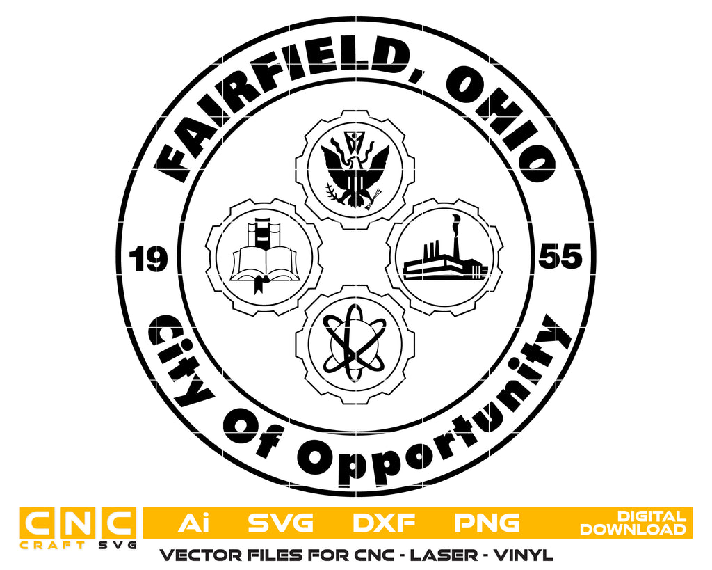 The Seal of Fairfield Ohio SVG is a detailed official city emblem recreated in precise vector format. Perfect for CNC cutting, laser engraving, vinyl decals, government signage, commemorative plaques, and municipal branding, this seal ensures scalable precision. With sharp vector lines, it performs seamlessly on wood, metal, fabric, and acrylic. An excellent choice for civic recognition, city memorabilia, and custom woodworking projects, this file delivers both authenticity and professional quality.
