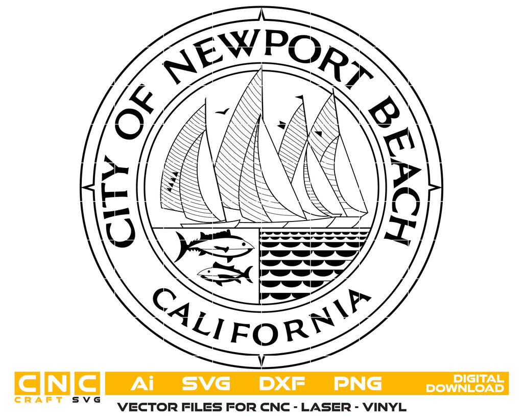 Create professional, high-quality designs with this Seal of Newport Beach, California SVG, a detailed vector illustration of the official city seal. Perfect for printing, engraving, apparel, signage, and digital projects celebrating Newport Beach’s heritage.