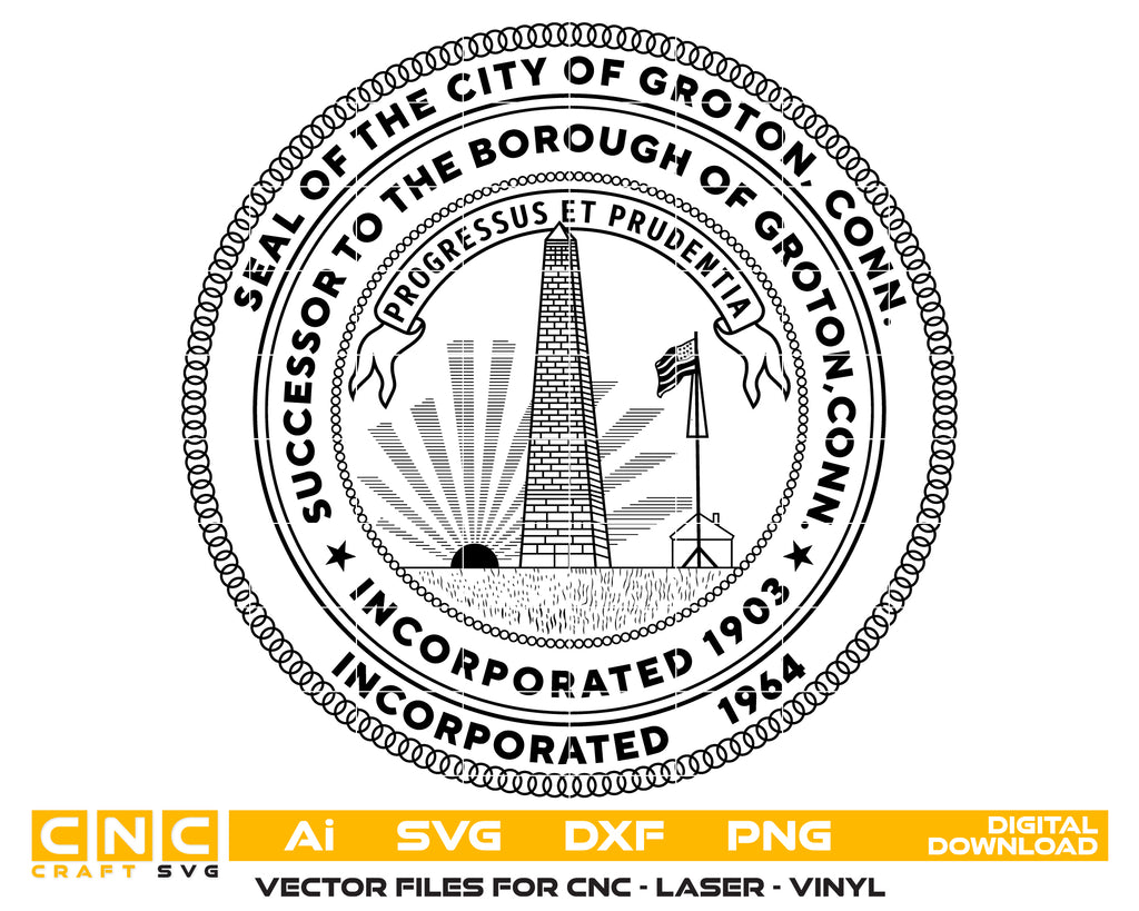 Create professional, high-quality designs with this Seal of the City of Groton, Connecticut SVG, a detailed vector illustration of the official city government seal. Perfect for printing, engraving, apparel, signage, and digital projects celebrating Groton’s heritage.
