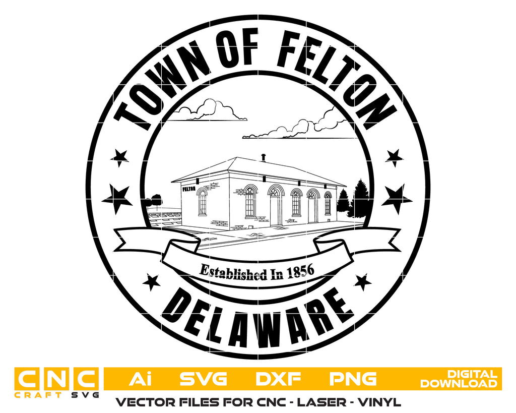 Create professional, high-quality designs with this Seal of the Town of Felton, Delaware SVG, a detailed vector illustration of the official town seal. Perfect for printing, engraving, apparel, signage, and digital projects celebrating Felton’s heritage.