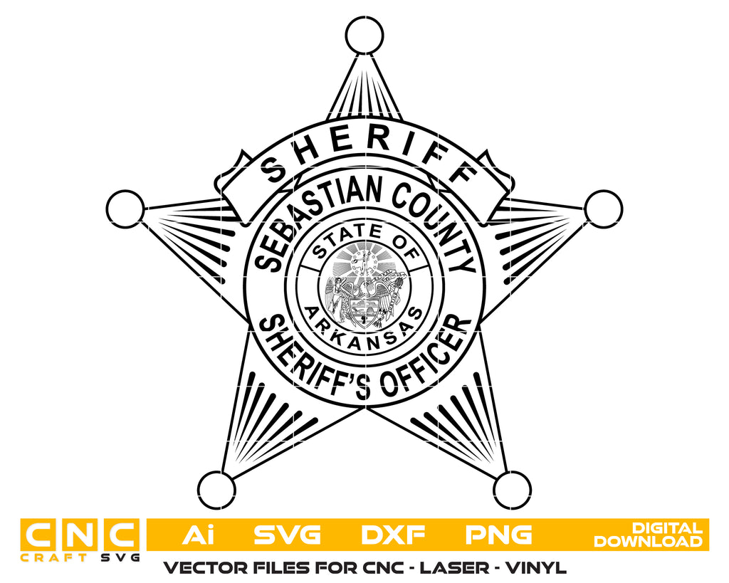 Create professional-quality law enforcement designs with this Sebastian County Sheriff’s Office Badge SVG, a clean and detailed vector badge inspired by the Sebastian County Sheriff’s Office in Arkansas. Designed for accuracy and clarity, this badge artwork is ideal for high-quality cutting, engraving, and printing applications.