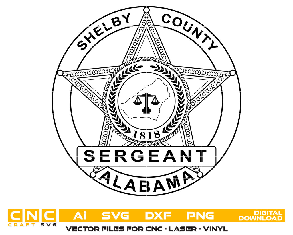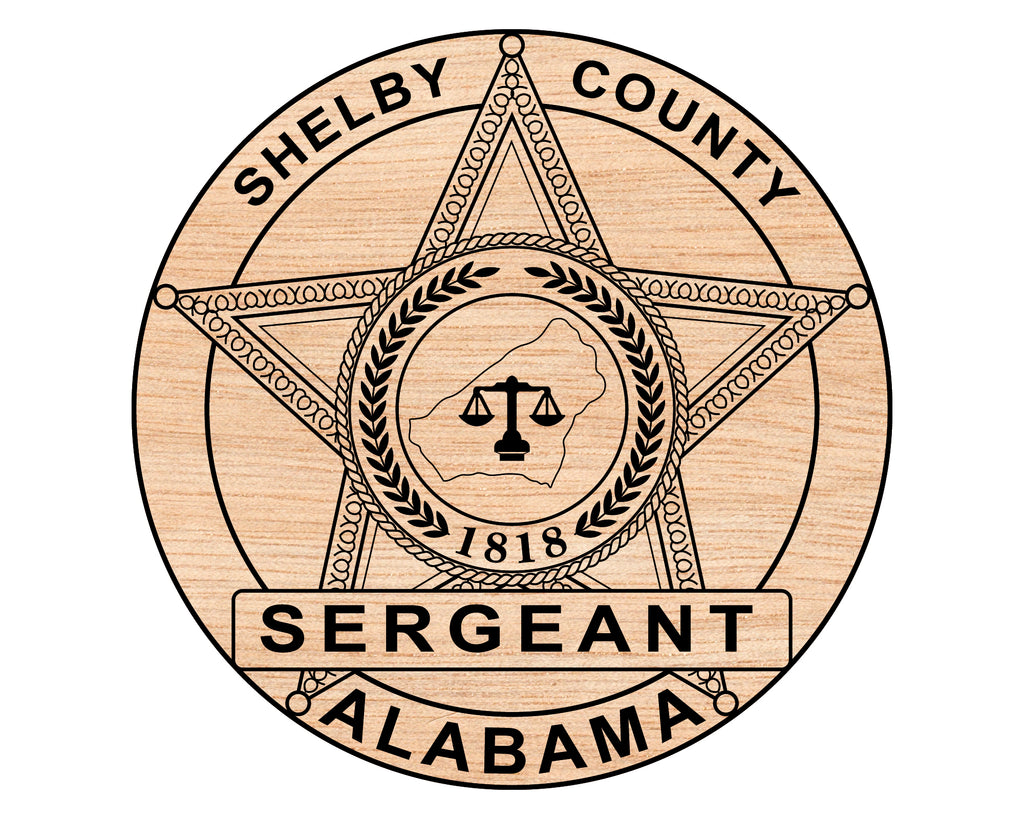 Download the Shelby County Alabama Sergeant Badge SVG, crafted with precision for laser engraving, CNC cutting, vinyl work, and digital printing. This professional vector file showcases detailed linework and authentic design — ideal for law enforcement memorabilia, signage, or personalized projects.