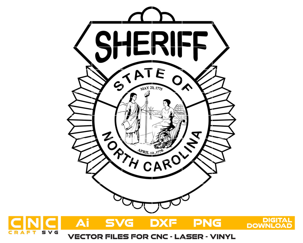 Honor the pride and heritage of North Carolina law enforcement with this finely detailed Sheriff Sunburst Badge SVG. Designed in scalable vector format, this badge is perfect for CNC cutting, laser engraving, vinyl decals, uniform artwork, and commemorative projects. With its clean lines and bold design, it symbolizes dedication, service, and integrity across North Carolina sheriff departments.