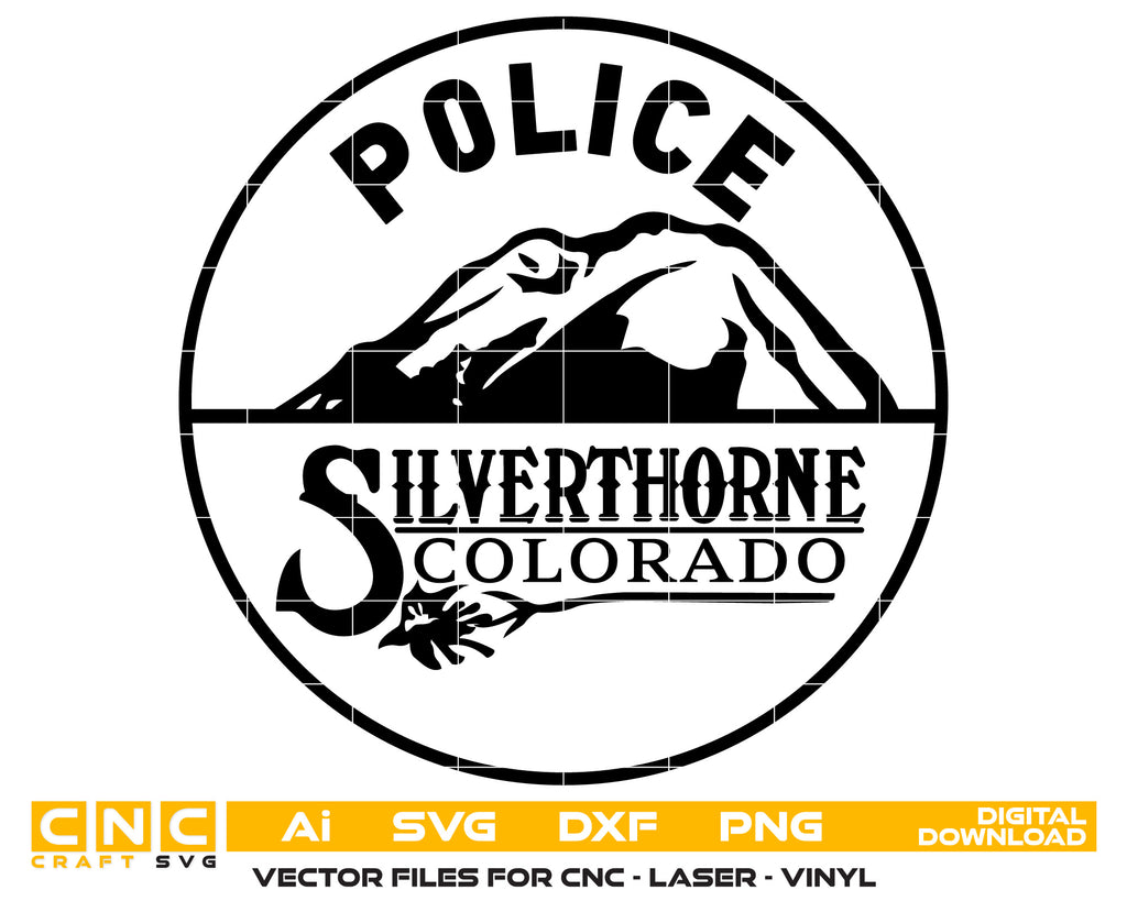 Honor local service with this precise Silverthorne Police Logo vector, ideal for custom projects. Designed for compatibility with Cricut, Silhouette, Glowforge, and laser engraving machines, this digital file is perfect for decals, t-shirts, signs, patches, and more.