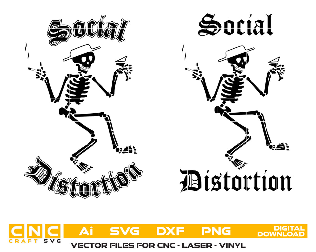 The Social Distortion Skeleton SVG features the iconic dancing skeleton associated with the legendary punk rock band Social Distortion. Designed in high-quality scalable vector format, this artwork is ideal for CNC cutting, laser engraving, vinyl decals, apparel, posters, signage, and collectible projects. Perfect for musicians, fans, designers, and collectors, it maintains crisp detailing on metal, wood, fabric, or acrylic, celebrating classic punk rock style with bold vector precision.