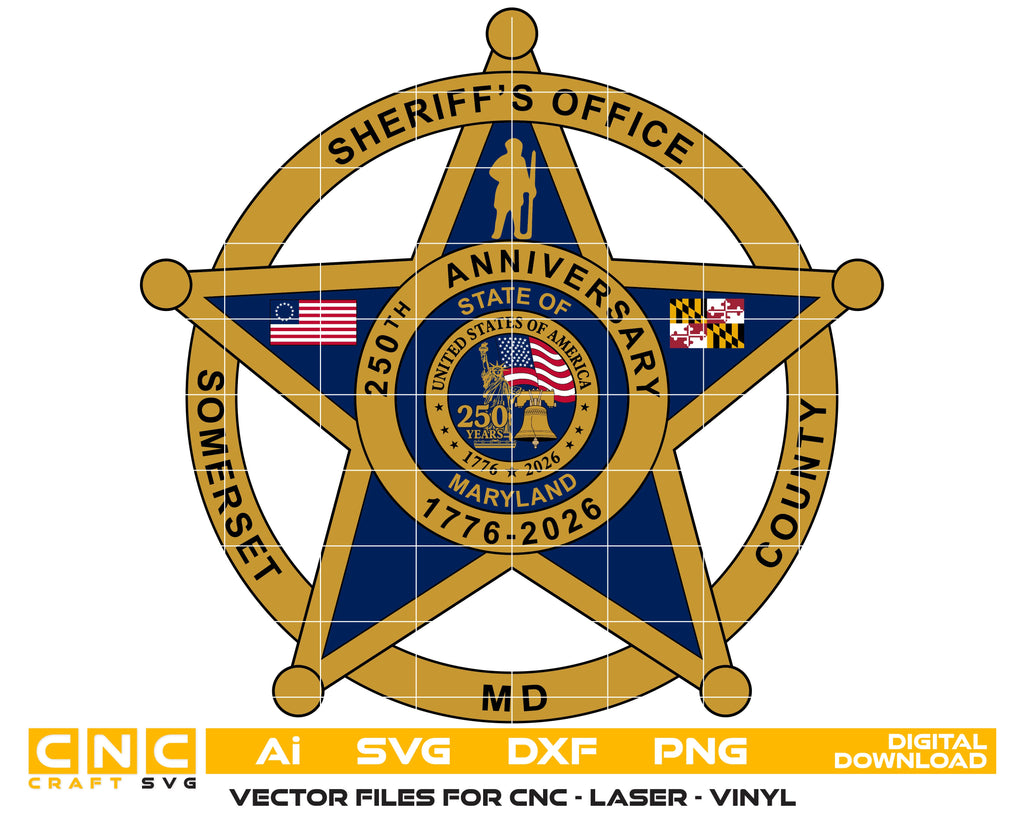 Celebrate a historic milestone with this Somerset County Maryland Sheriff's Office 250th Anniversary Emblem SVG. This highly detailed vector design commemorates the USA 250th Anniversary (1776-2026), featuring the official Maryland state flag, the United States flag, and the iconic Somerset County Sheriff badge. Expertly crafted with clean, sharp paths, this file is optimized for wood engraving, metal laser etching, and CNC routing. It is the perfect choice for creating commemorative plaques, law enforcement gifts, or patriotic signage to honor Maryland public safety history.